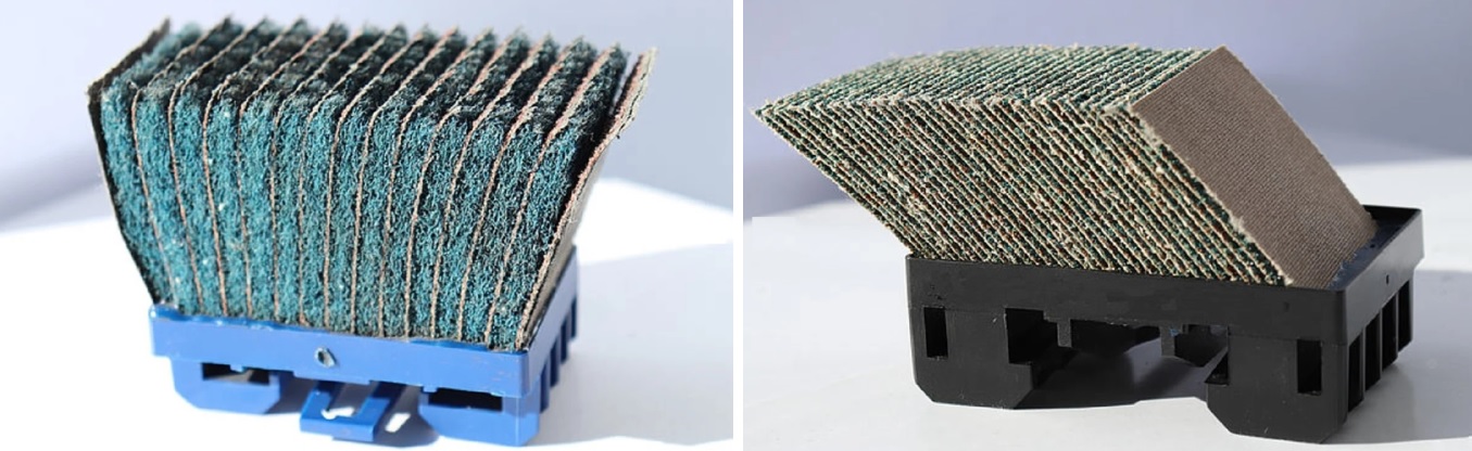另一个关键因素是磨料纤维毡,这是一种掺有磨粒的特种纤维材料,主要用于边缘倒圆。它不仅能够保证材料去除效率,还能在盘式工具或倒圆模块中协调各砂布单元的工作。只有将磨料纤维毡与砂布基材正确组合,才能赋予工具特定的边缘倒圆特性。